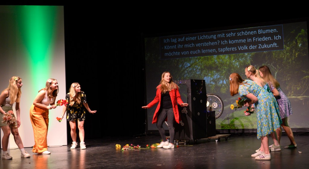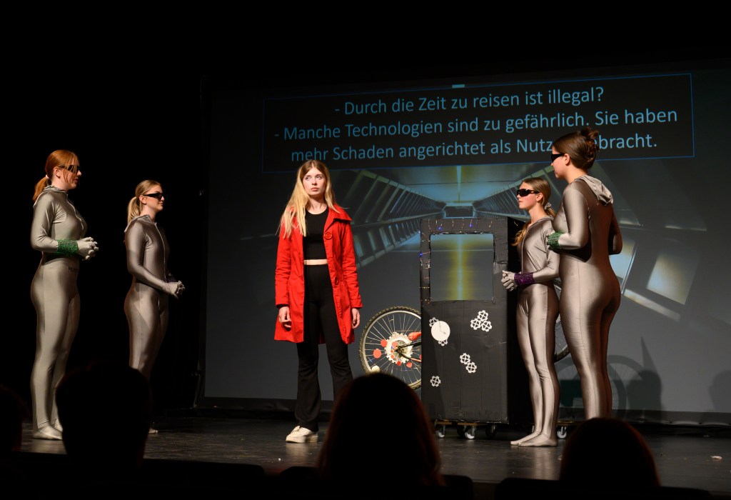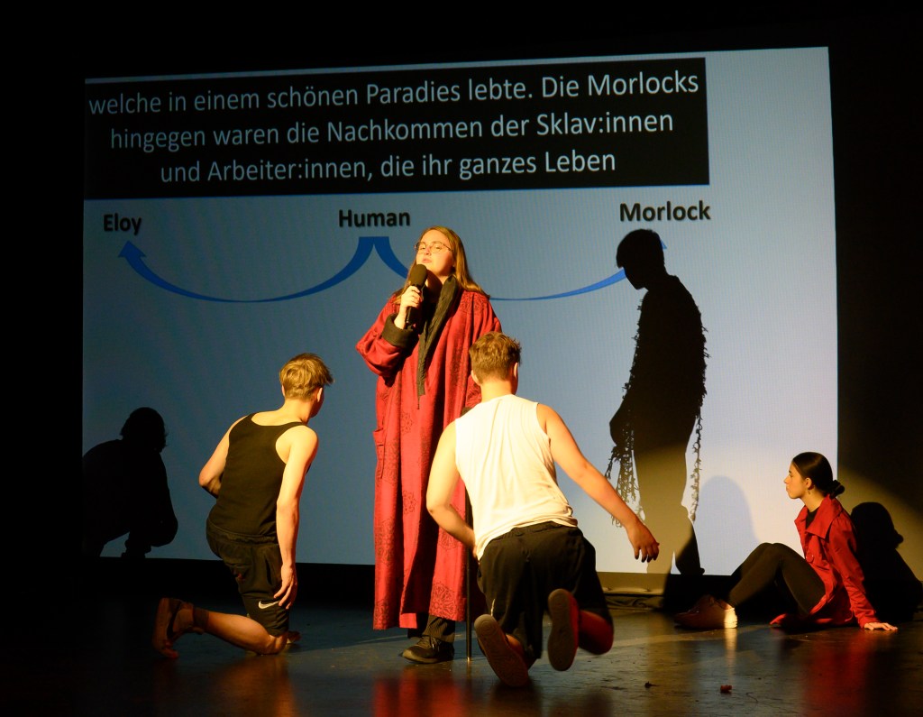 Die jungen Schauspieler:innen des Kufstein English Theatre zeigen diesmal ein fantastisches Bühnenspektakel, das auf der klassischen Geschichte von Eloys und Morlocks basiert, aber auch noch von weiteren Zeitreisen ins Morgen und ins Gestern erzählt.